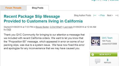Thank you QVC Community for bringing to our attention a message that we included with recent California orders. We want to let you know that the “Proposition 65" message, which appeared in error on some of our packing slips, was due to a system issue. We have now fixed this error and apologize for any inconvenience that we may have caused you.