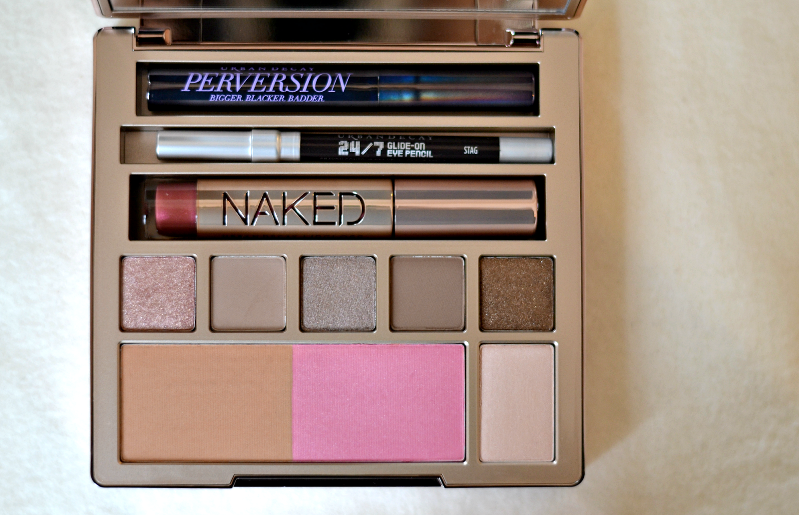 I just bought this one for my Thanksgiving travel. it's brand new from Urban Decay. It doesn't have a brush but it has eyeshadows, blush, eyeliner, mascara, and lip color.