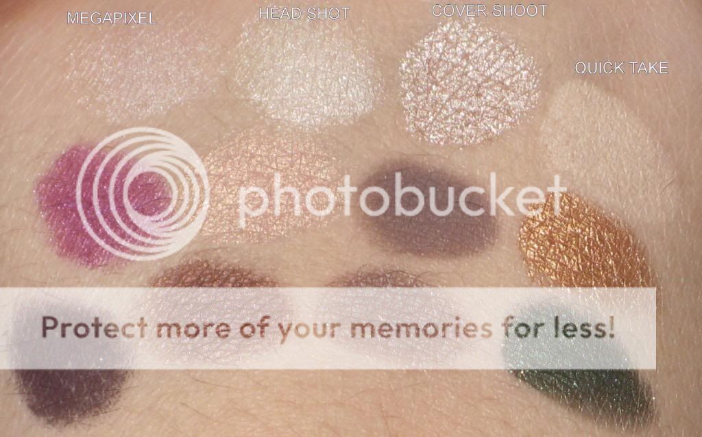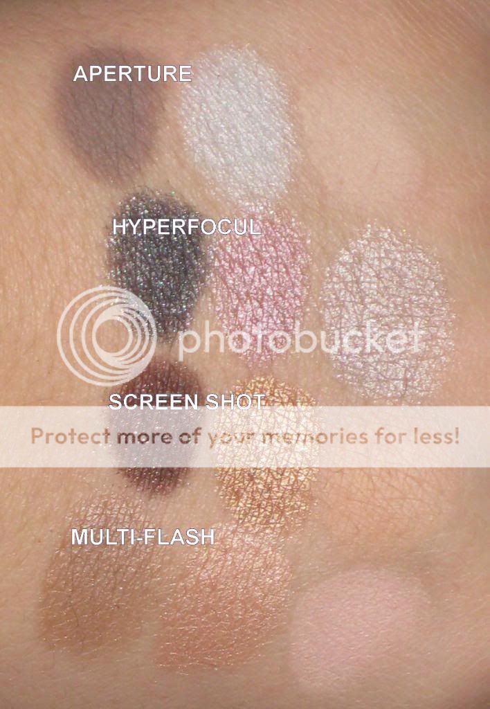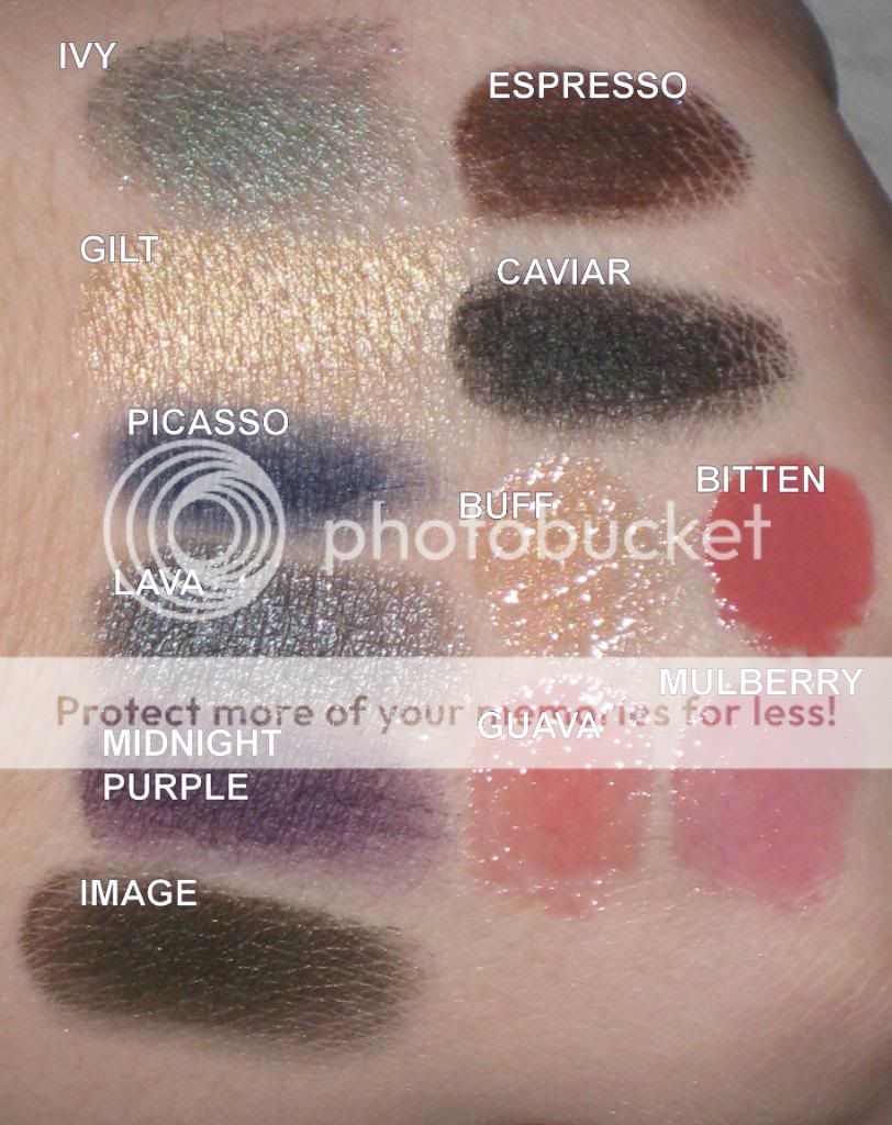 Here are swatches of the photo op mega palette: They are a tiny bit lighter in the pics because of the flash from the camera. These shadows are uber pigmented and wonderful! ![]()
