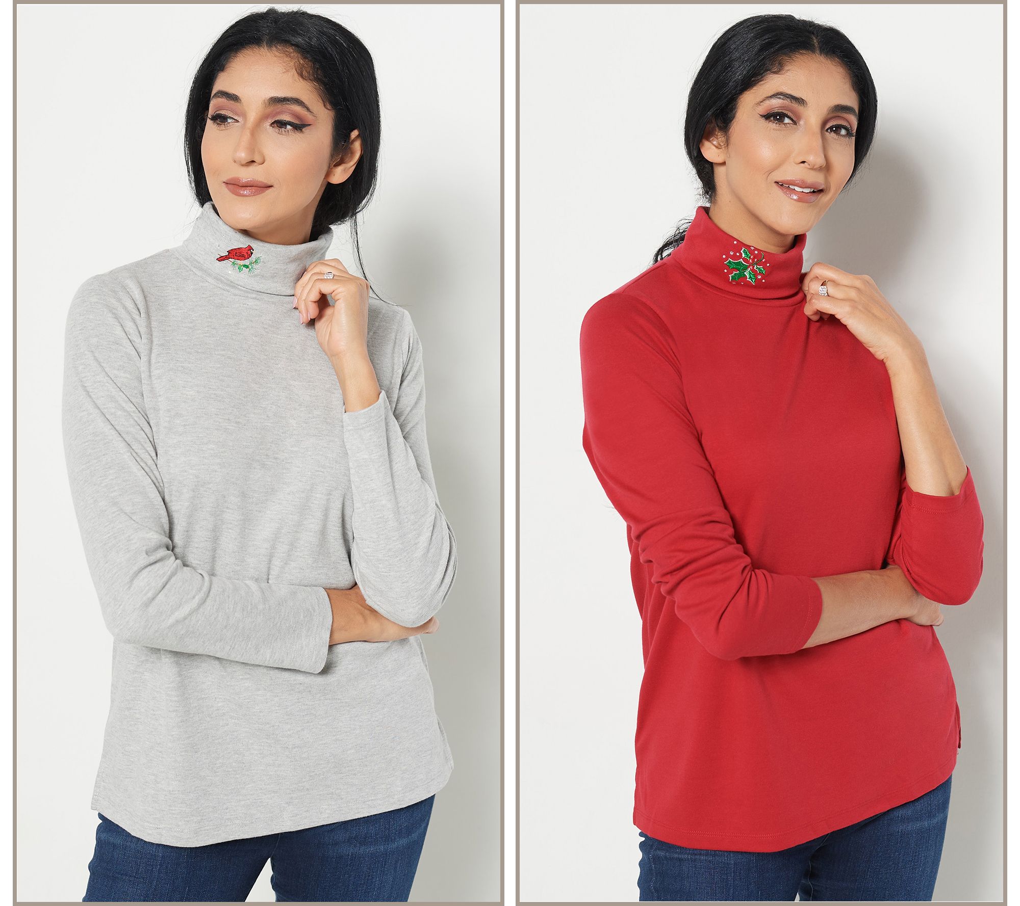 I love the turtlenecks that were on today and want to order A461760 in Heather Grey/Ruby Red. I don't look great in grey, but will wear it under something else. But I love the red with holly on the collar. Can anyone help me with the actual color of Ruby Red? Is it a darker or lighter red? Is it blue toned or more warm toned? TIA! ![]()