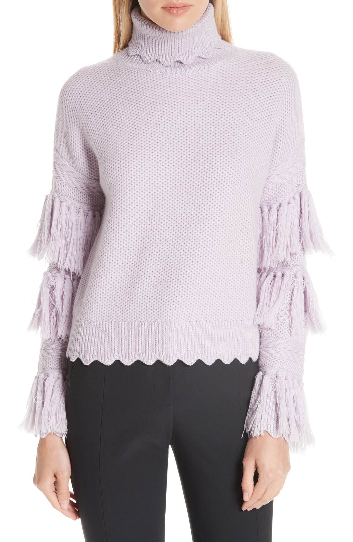 I called this sweater "Overdone." Some of these designers don't know when to stop. Scallops and fringe. Believe it or not, it is $395.00 (LOL). One thing I will give it, pretty color.