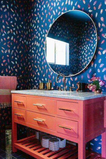 I like it a lot. I woudn't mind having a bathroom like that. Love the pink vanity and fun colorful wallpaper. But.... I would prefer this bathroom to be a smaller, guest bathroom, or half-bath. I prefer the bathroom that I would use most often, the one in my bedroom, to be more serene, with mostly solid creams and/or whites.