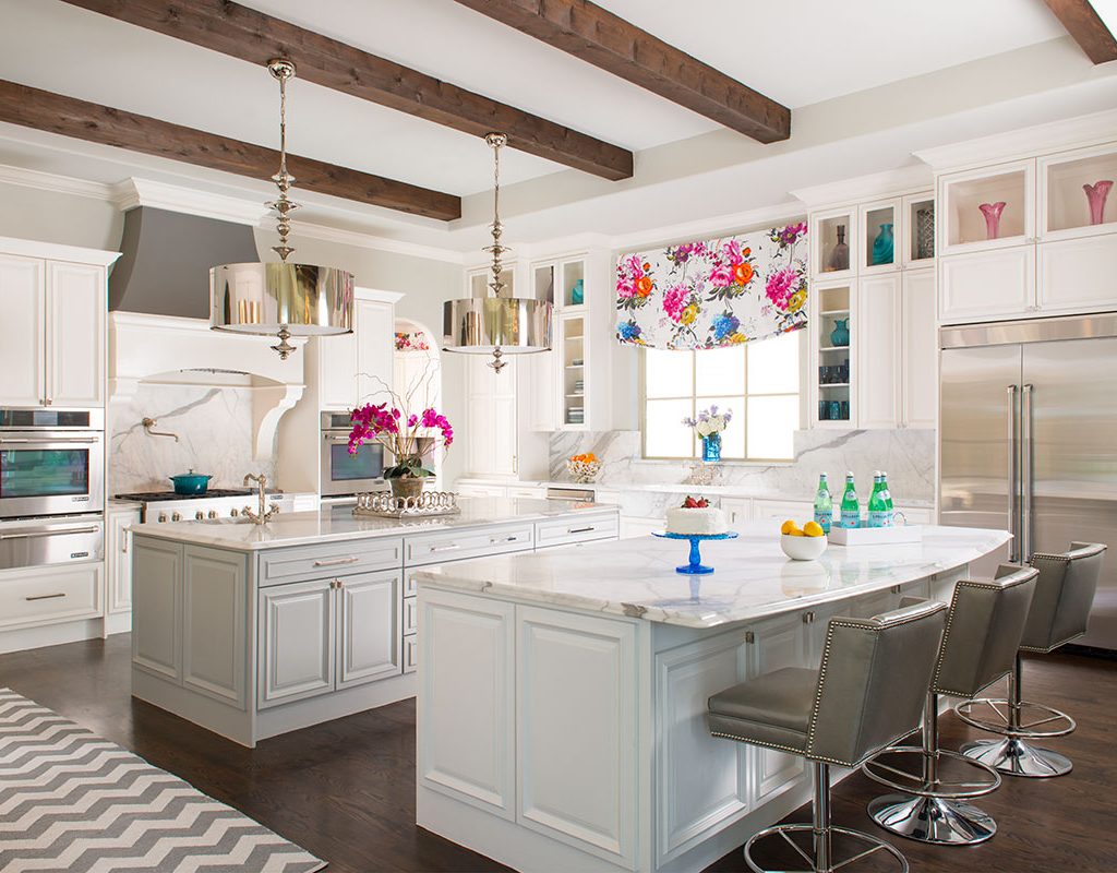 Well, you probably are all well aware of my feelings on any wallpaper so that would have to go. I do like the glass door cabinetry with all the various colored glass items. However, I would only like it if there were plenty of kitchen cabinets on the other side of this kitchen with regular doors to hide all my "stuff" that I use.