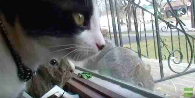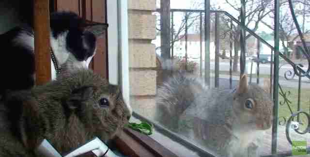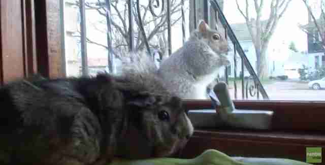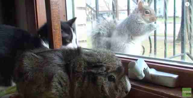 A cat and guinea pig from Florida were hanging out by the window one afternoon when suddenly, a squirrel appeared.