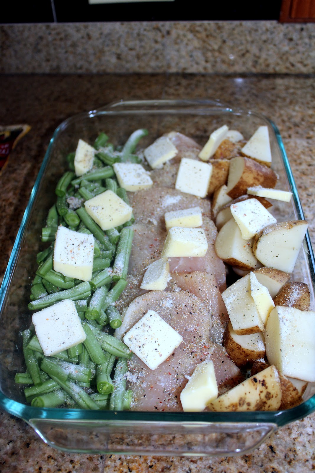 4. Cut the butter in slices and layer it over the green beans, potatoes and chicken. Sprinkle the Italian dressing mix over the entire pan. Cover with foil.